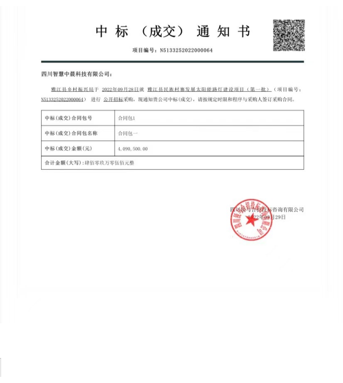 今年9月28日,四川智慧中晨科技有限公司與雅江縣鄉村振興局本著新農村發展建設項目的原則達成了雅江縣民族村寨發展太陽能路燈建設項目的的第一批與第二批的戰略協議。第一批主要采購內容為:太陽能路燈650盞同時需要安裝完成650盞路燈,需要滿足的要求為高7米。總預算為4499996元人民幣,中標金額為4387500元人民幣 。第二批的采購內容為太陽能路燈606盞同時需要安裝完成606盞路燈,需要滿足的要求為高7米。總預算為4240995元人民幣,中標金額為4090500元人民幣 。整體工期為60-90天完工。此次也是為雅江縣民族村寨發展促進做出的又一重大舉措。此次能夠順利中標是智慧中晨科技公司發展實施邁下堅實的一步。相信在的中晨智慧科技公司嚴謹做事的態度下,經過正常保障的工期里,一定會把雅江縣民族村寨路燈照明這塊得到完善的改進,同時也會為整個村寨建設發展成為重要的一點。